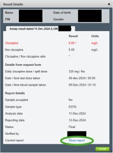 It has come to our attention that a file formatting error has caused incorrect sampling times to be displayed in the Result Details window on the BloodResults portal for some clozapine assay samples. It only seems to affect those which were sampled in the afternoon.